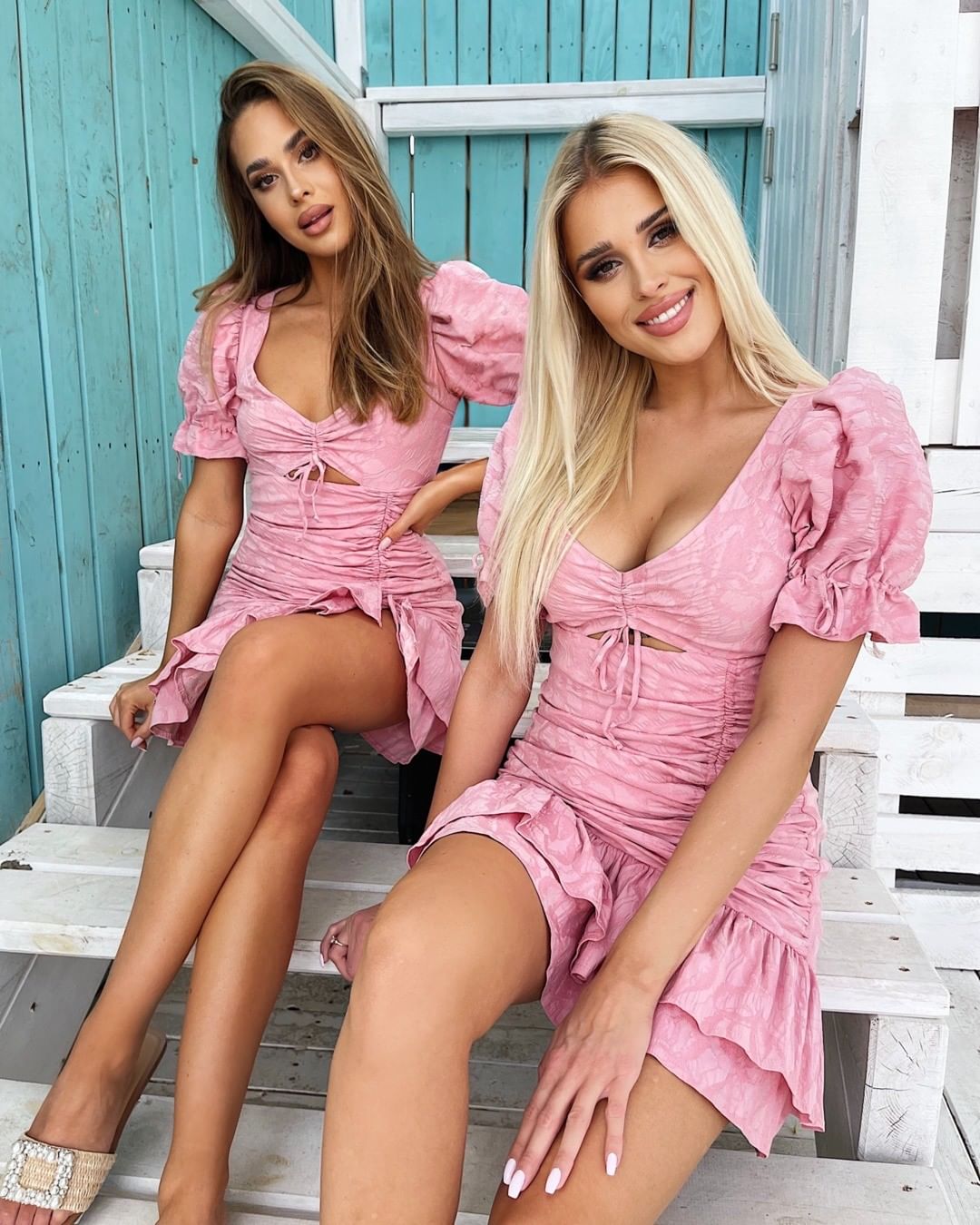 Krásné šaty mini s krátkým rukávem, obláčky s mašličkami, ozdobný asymetrický volán. Sladký odstín růžové a četné ozdobné prvky dělají ze šatů Astrid ideální volbu pro letní schůzky. Efektní zavazování na poprsí a volán na boku umožňuje přizpůsobit tento model tvaru těla.