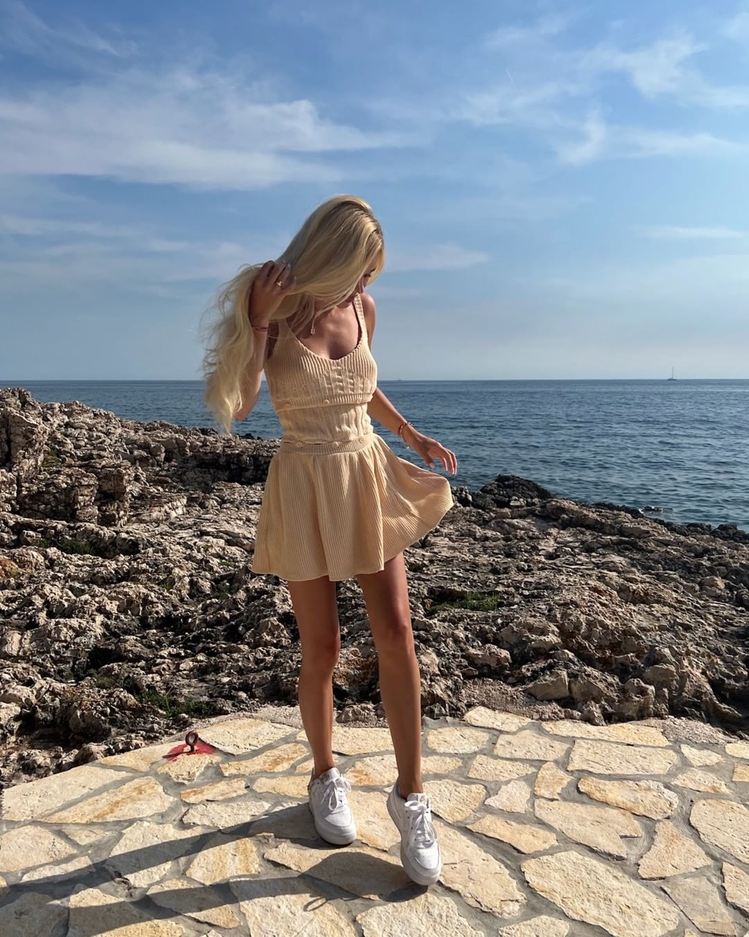 Přesně takové šaty jsem potřebovala na svou dovolenou. Dají se nosit jako celek nebo jako samostatná kombinace topu a sukně. A chytrý doplněk v podobě šňůrky, kterou jsem vsunula místo knoflíkových dírek na sukni, je naprostým hitem. Díky tomu jsem měla stabilitu a perfektně mi seděla v pase. Toto řešení jsem využila i v samotné kombinaci horního a spodního dílu. Velikost odpovídá té, kterou nosím každý den. Doporučuji