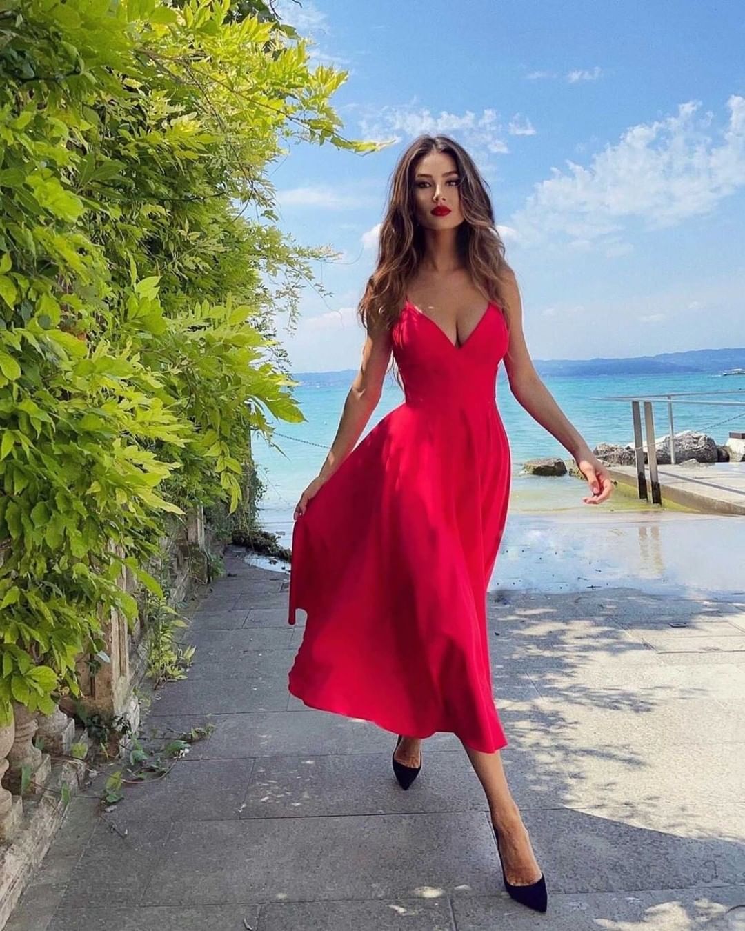 • Ženské červené midi šaty. Otevřená záda, tenká ramínka a koketní výstřih.